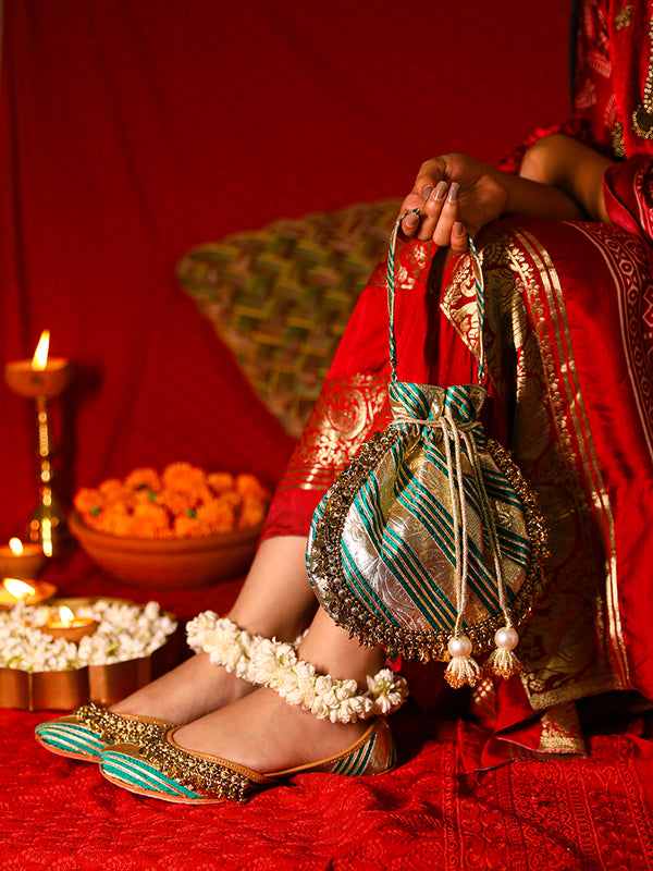 To complete your bridal look, consider pairing your juttis with a matching bridal potli bag. These drawstring bags are not only functional but also add an element of traditional elegance. Opt for golden potlis adorned with embroidery, sequins, or beadwork to coordinate seamlessly with your juttis and outfit.