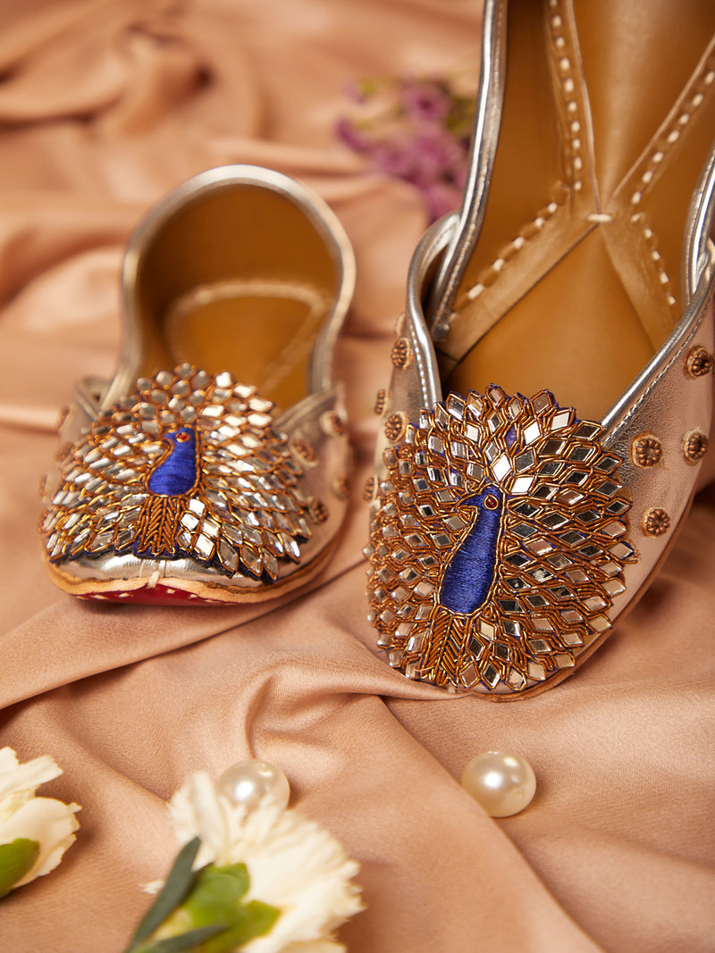If you prefer a more subtle yet sophisticated look, silver juttis are perfect. Their neutral tones and delicate embellishments make them a versatile option for festive occasions. Style them with pastel sarees or heavily embroidered anarkalis for an ethereal vibe. These silver juttis combine comfort and glamour and shine making them an essential addition to your festive wardrobe.