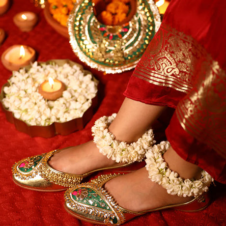 At Eid special collection, our designer juttis are handcrafted with premium materials, adorned with intricate beadwork, zari, and mirror embellishments that will enhance any Eid outfit. Choose from a variety of colors, including golden juttis, silver juttis, or even shiny juttis to match your attire. Whether you prefer a traditional design or a more contemporary look, Punjabi juttis from 5 Elements are the perfect way to celebrate Eid.