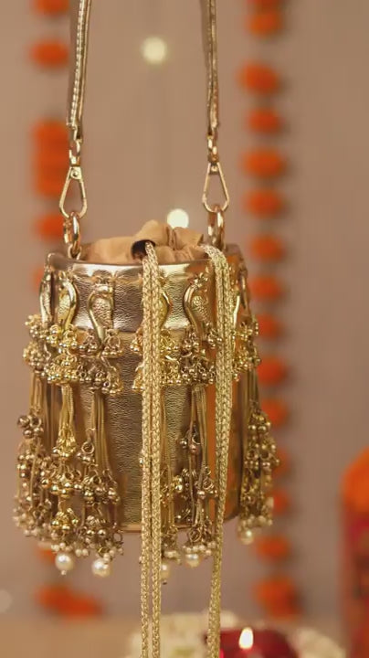 The Adhira Potli is a magnificent blend of grandeur and tradition, crafted in a regal metallic gold finish. Adorned with intricately sculpted peacock motifs and cascading tassels embellished with beads and pearls, it exudes a royal charm. The cylindrical silhouette adds a touch of modern sophistication, while the delicate handle ensures effortless elegance. Perfect for festive occasions and weddings, this potli is a true heirloom piece radiant, graceful, and timelessly luxurious.