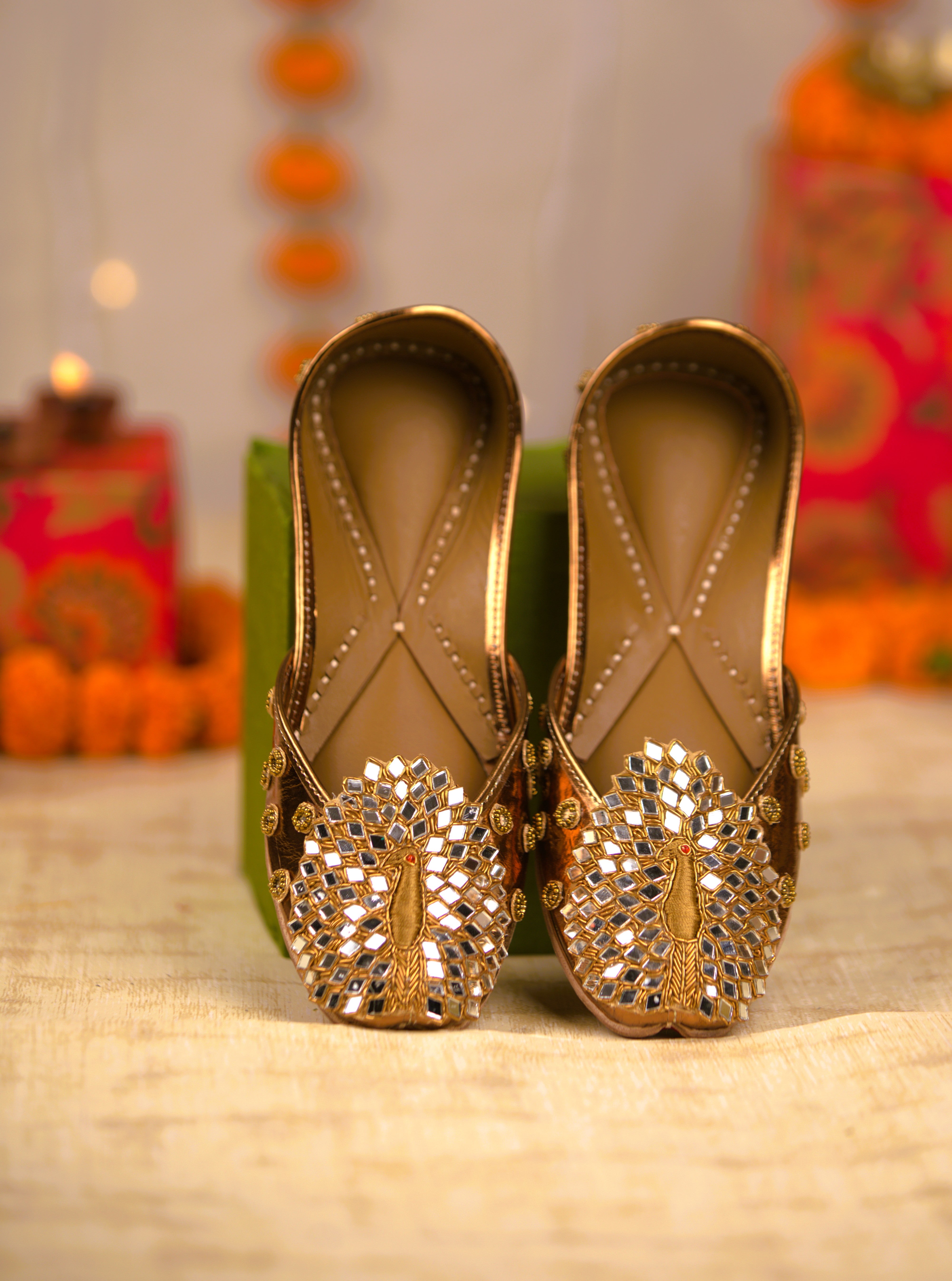 The Gold Peacock juttis are a celebration of regal elegance, featuring a dazzling embroidered peacock motif crafted with resplendent mirror work and intricate zardozi embroidery. Set on a luxurious golden silk base, the deep blue and copper threadwork on the peacock adds vivid contrast and richness. Sparkling sequins dot the body, enhancing the festive charm. With hand stitched insoles and delicate craftsmanship, these juttis merge tradition with flair, making them an unmissable statement piece for weddings and grand celebrations.