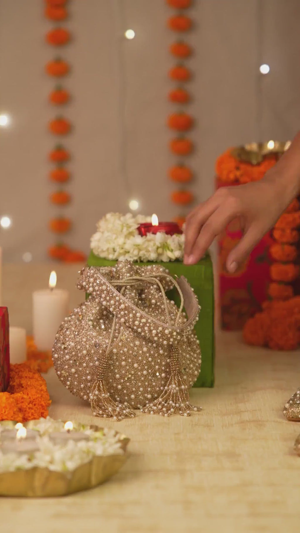 The Ishvini Potli exudes ethereal elegance with its all-over pearl and bead hand-embroidery that catches light in the most delicate way. Crafted in a soft gold hue, it features a structured silhouette with a drawstring closure adorned with cascading tassels. The pearl-studded handle adds to its refined charm, making it a perfect companion for weddings, festive gatherings, and evening celebrations. Every detail of this potli reflects luxury and timeless femininity, seamlessly blending classic grace with modern sophistication.