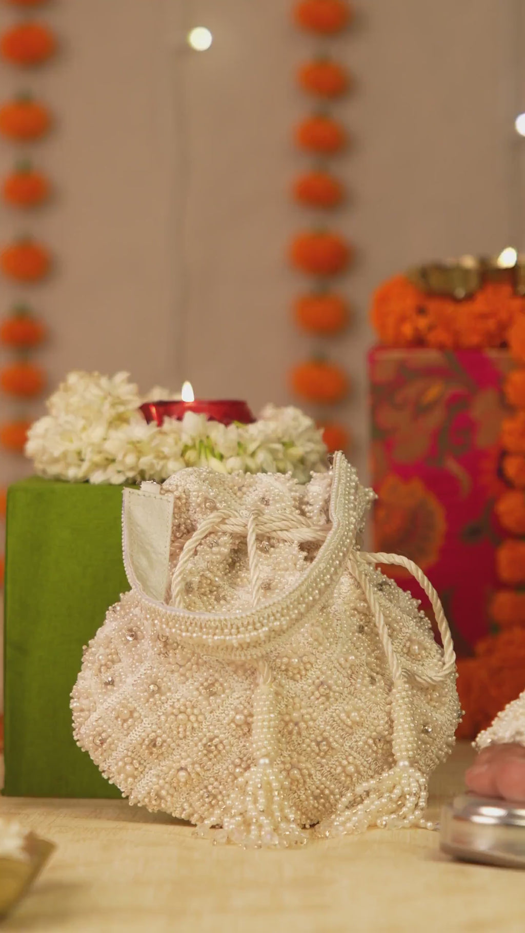 The Nivriti Potli embodies understated opulence with its pristine ivory tone and intricate pearl hand-embroidery. Each bead is meticulously placed to form delicate patterns, creating a soft, textured allure. The potli features a pearl-adorned handle and tasselled drawstrings that add a graceful movement to its design. Elegant yet versatile, it complements both traditional and contemporary ensembles, making it an exquisite choice for weddings, festive occasions, and evening soirées. A timeless accessory that radiates refined sophistication and serene beauty.